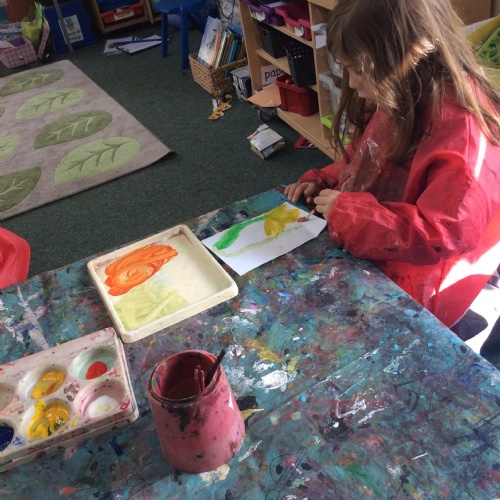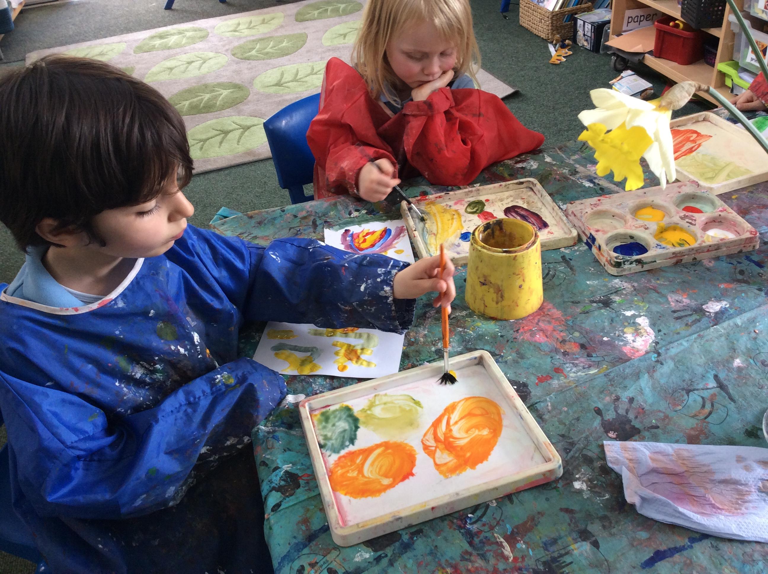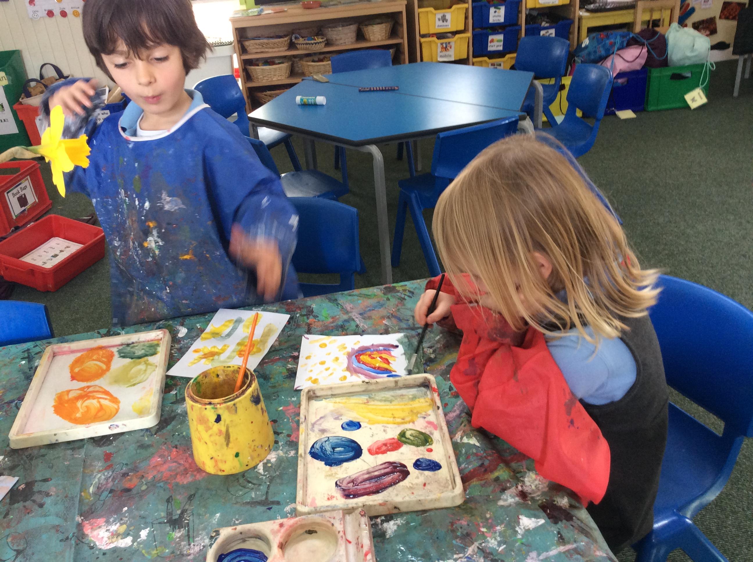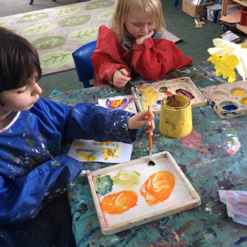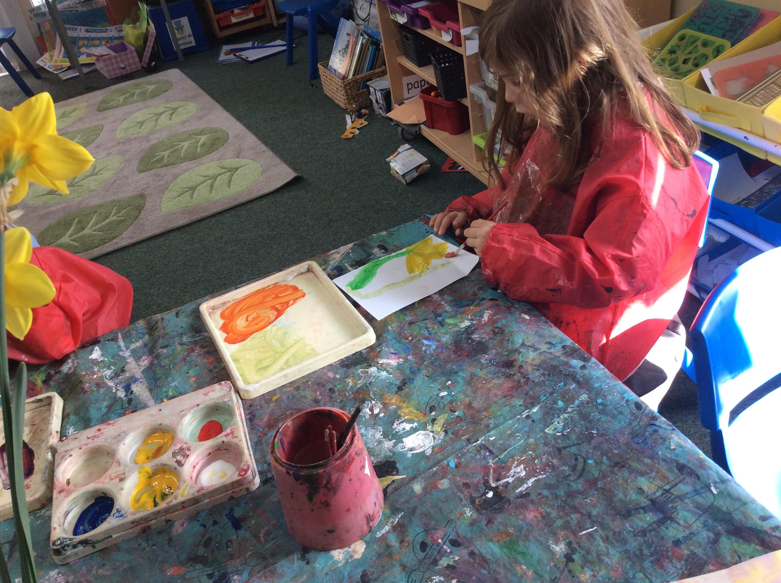 We have been learning about the season of Spring and have spotted lots of different Spring flowers growing.  Everyone had a go at painting daffodils with lots of mixing of paints and some took this further to create their own pictures too.