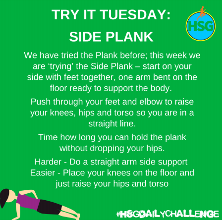 I hope you managed to have a go at the skipping challenge yesterday. Ella did a record breaking 92 skips in 1 minute! I wonder if she will beat that today or anyone else managed anywhere near that number !? I know I wouldn't be able to do that many ! Today's physical challenge is the side plank which is particularly tricky. I would try doing it twice, once on each side.