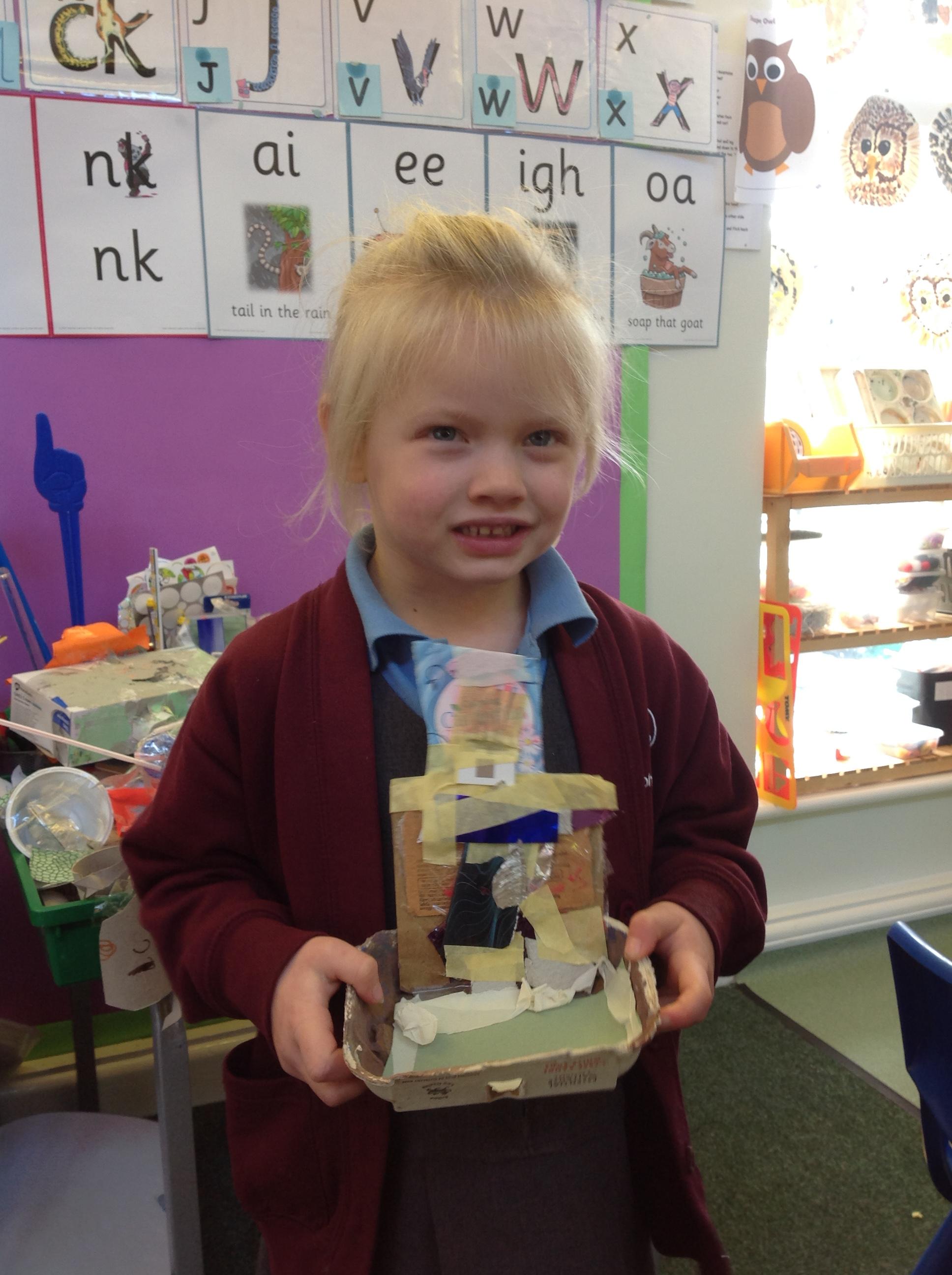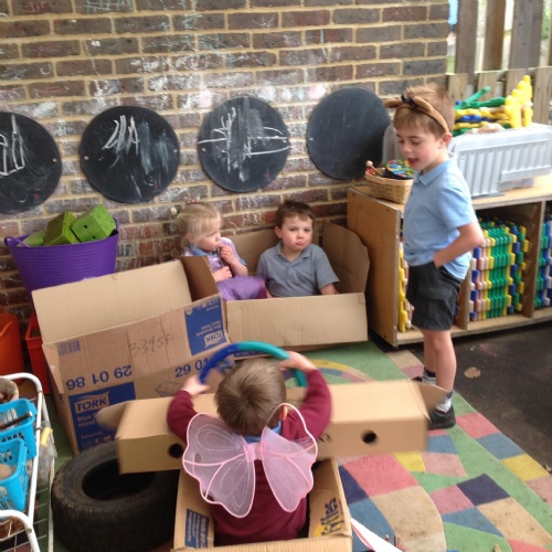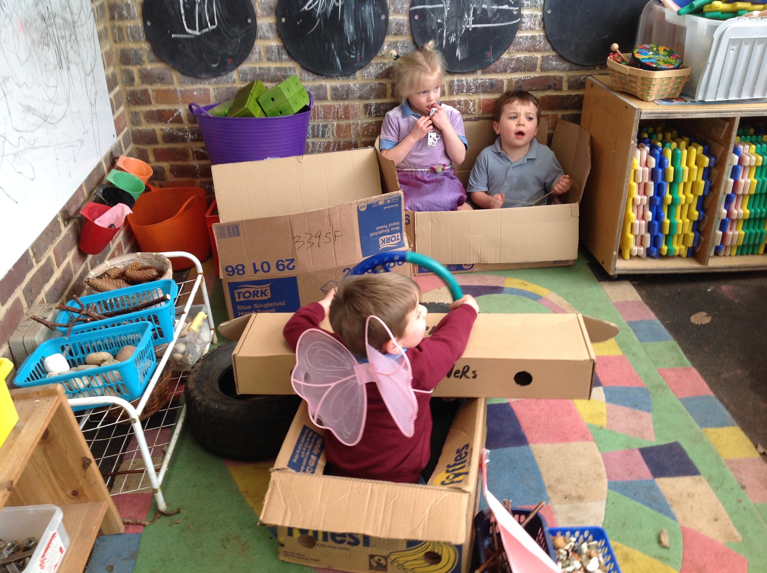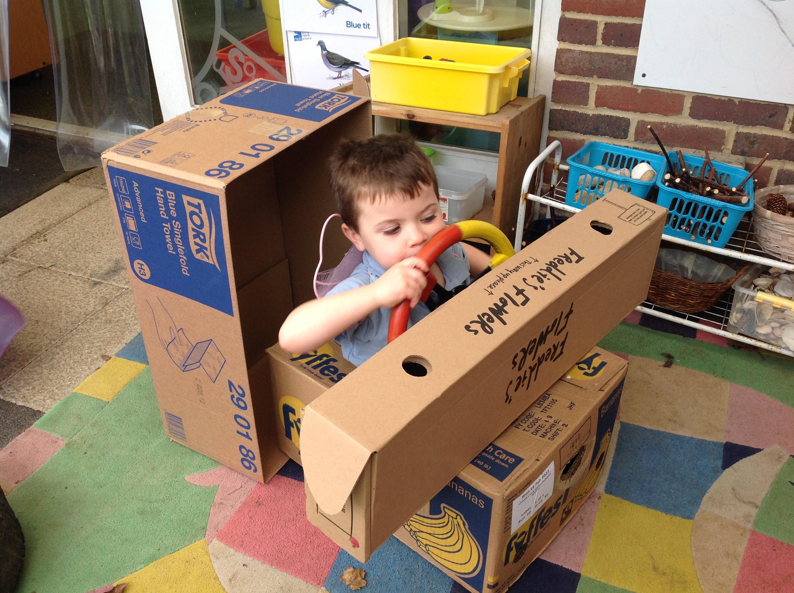 Some children made a fire engine from boxes to drive to an emergency which then a little later changed back into a family car!