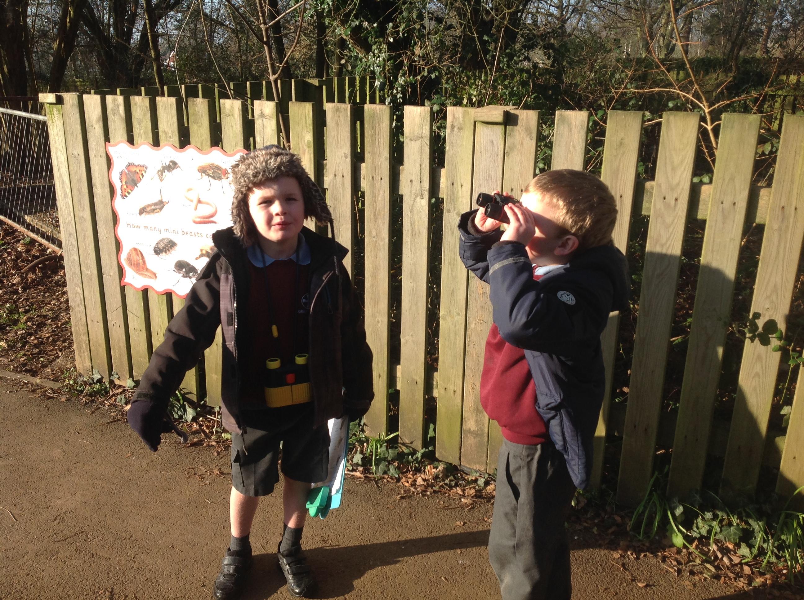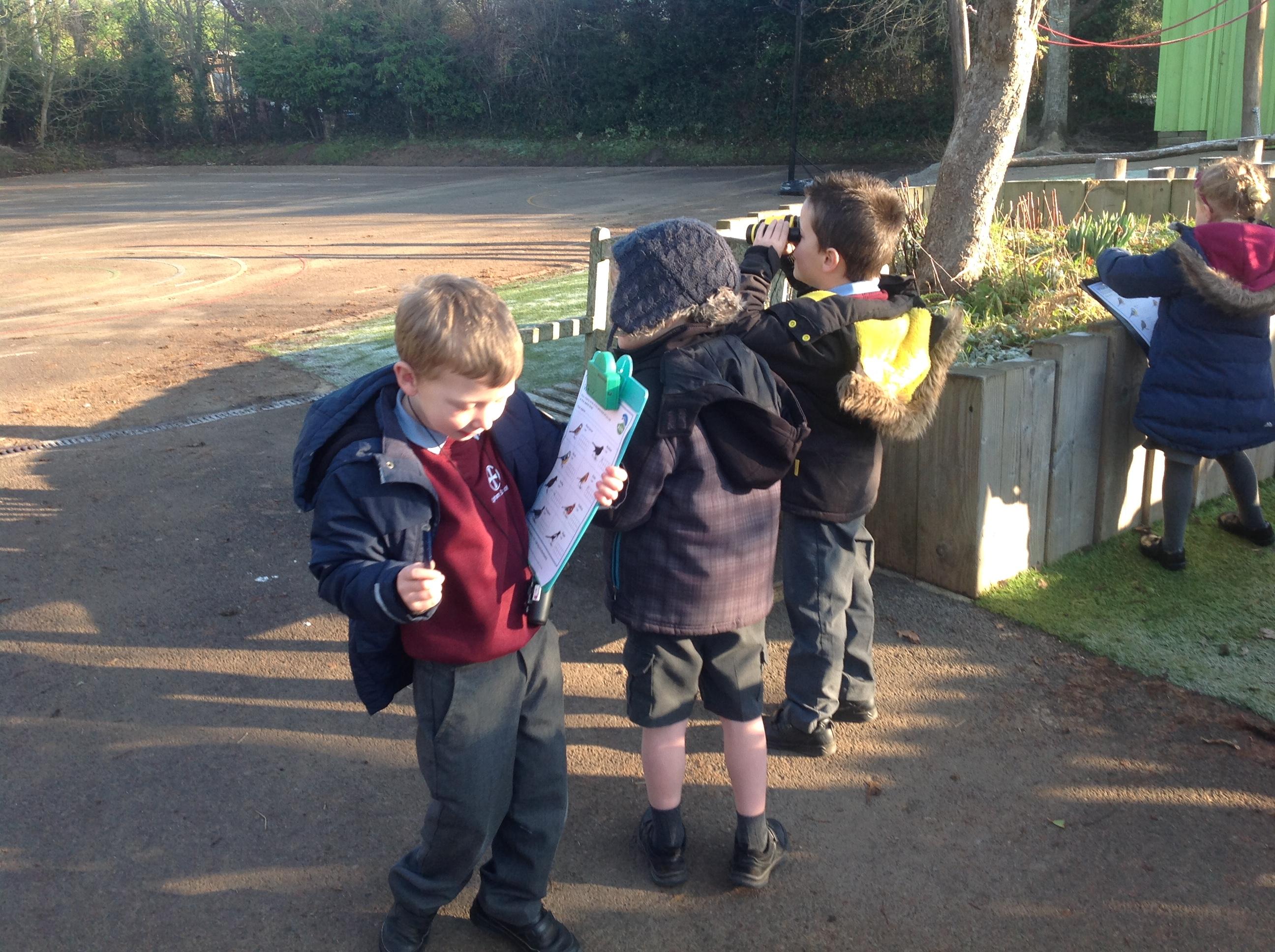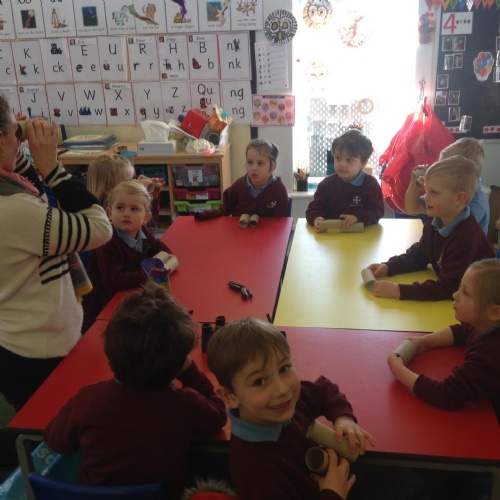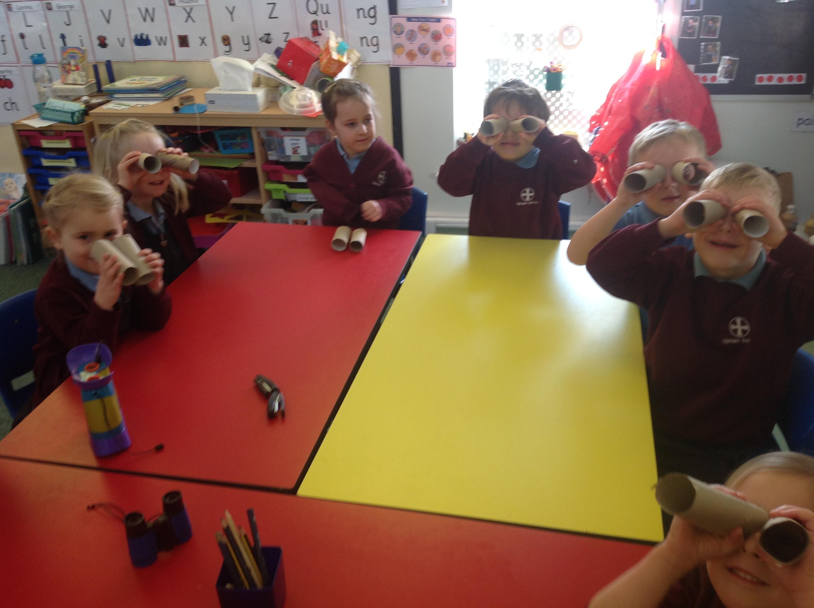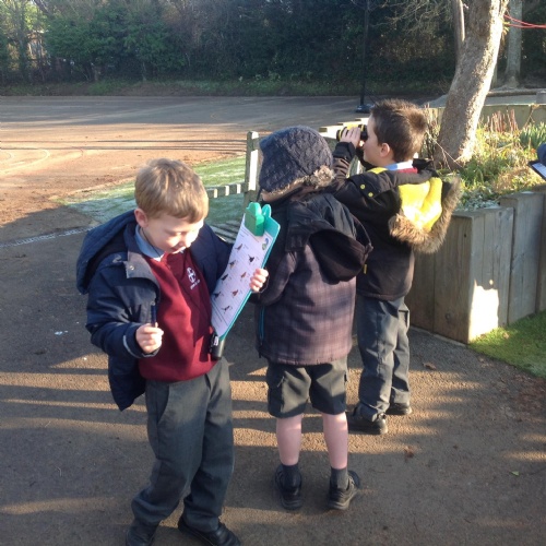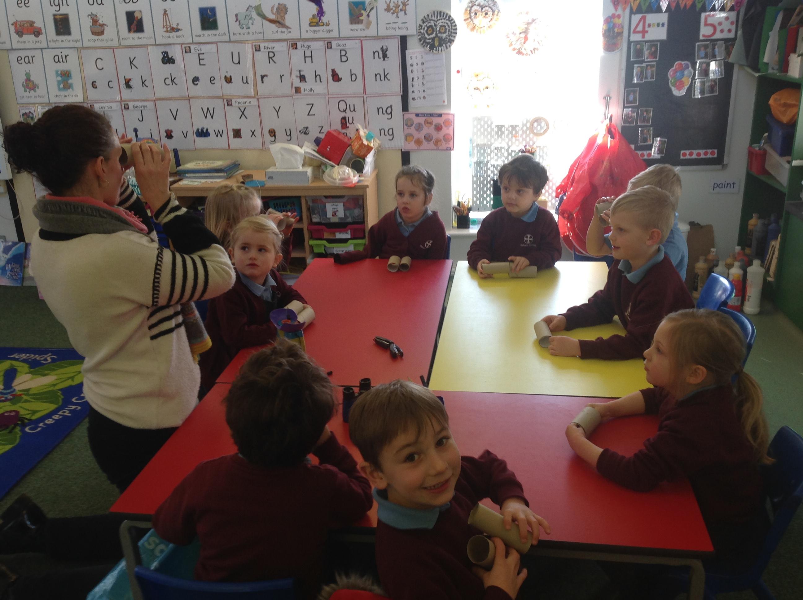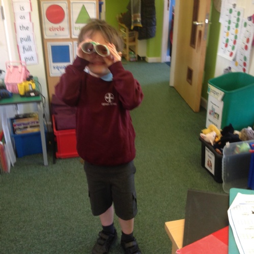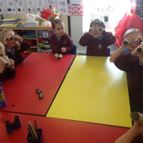 We all had a go at making binoculars on the day of the Great School Bird Watch and then we went out in groups to see what different birds we could see sitting in the school grounds. We saw crows, pigeons, black birds, wagtails and a robin, and various other birds flying overhead. We also saw a pair of crows sitting on their nest up high in a tree.
