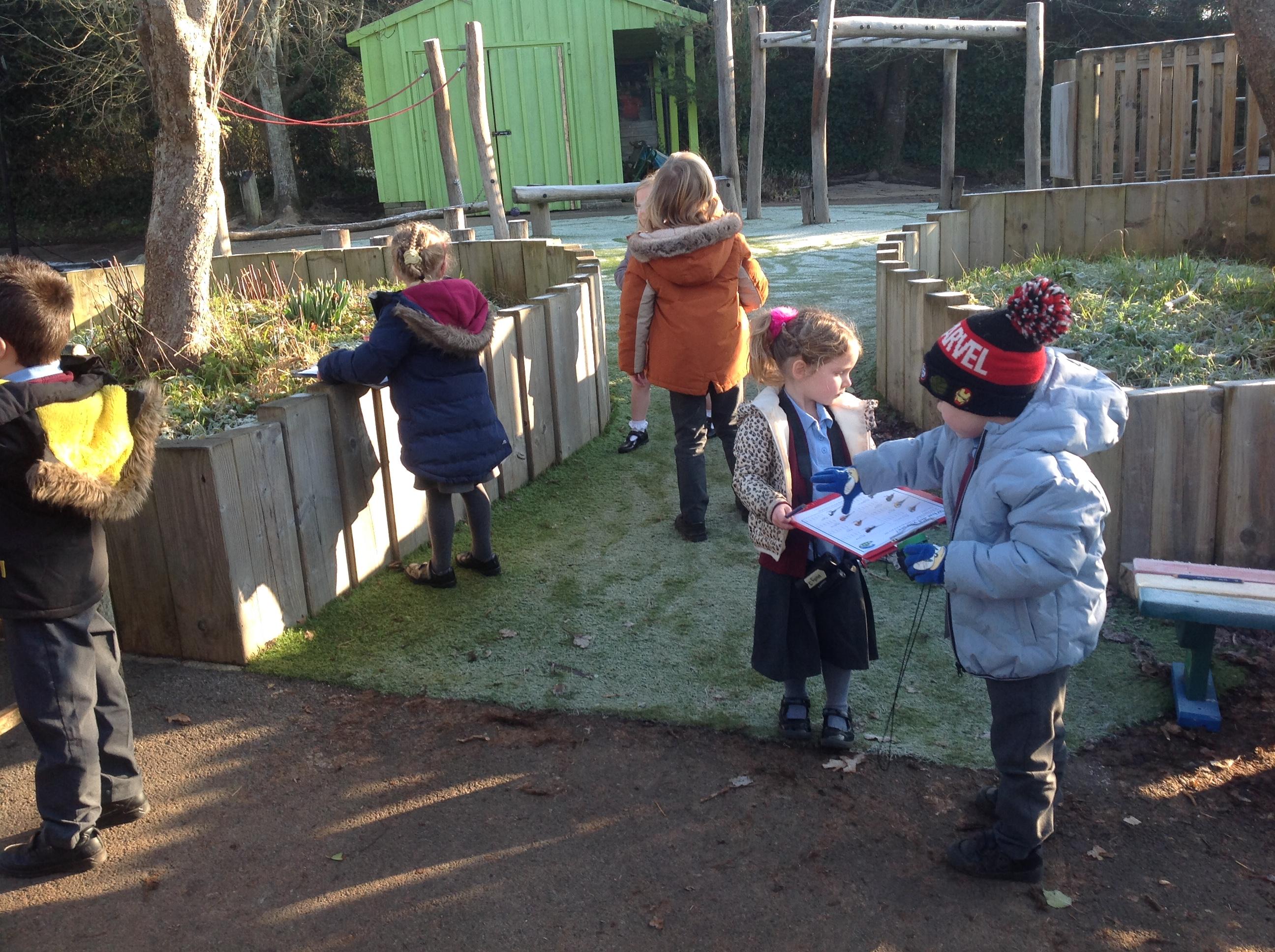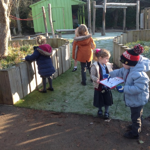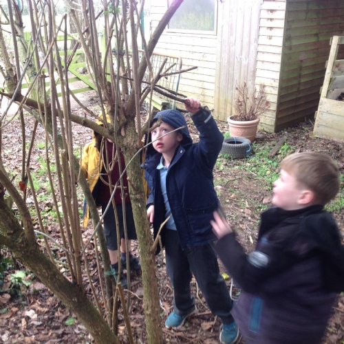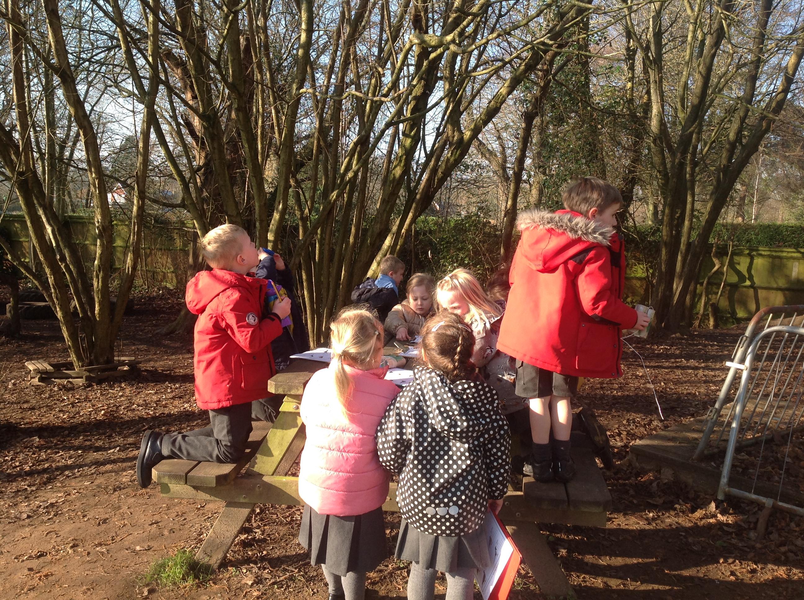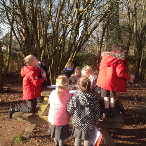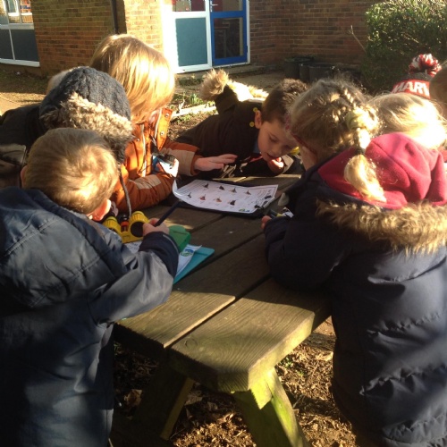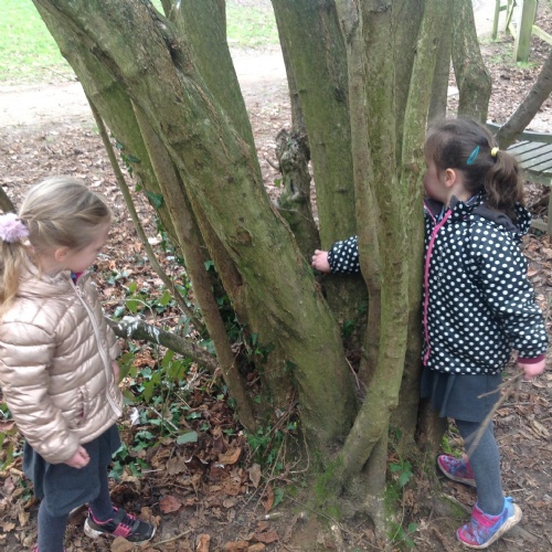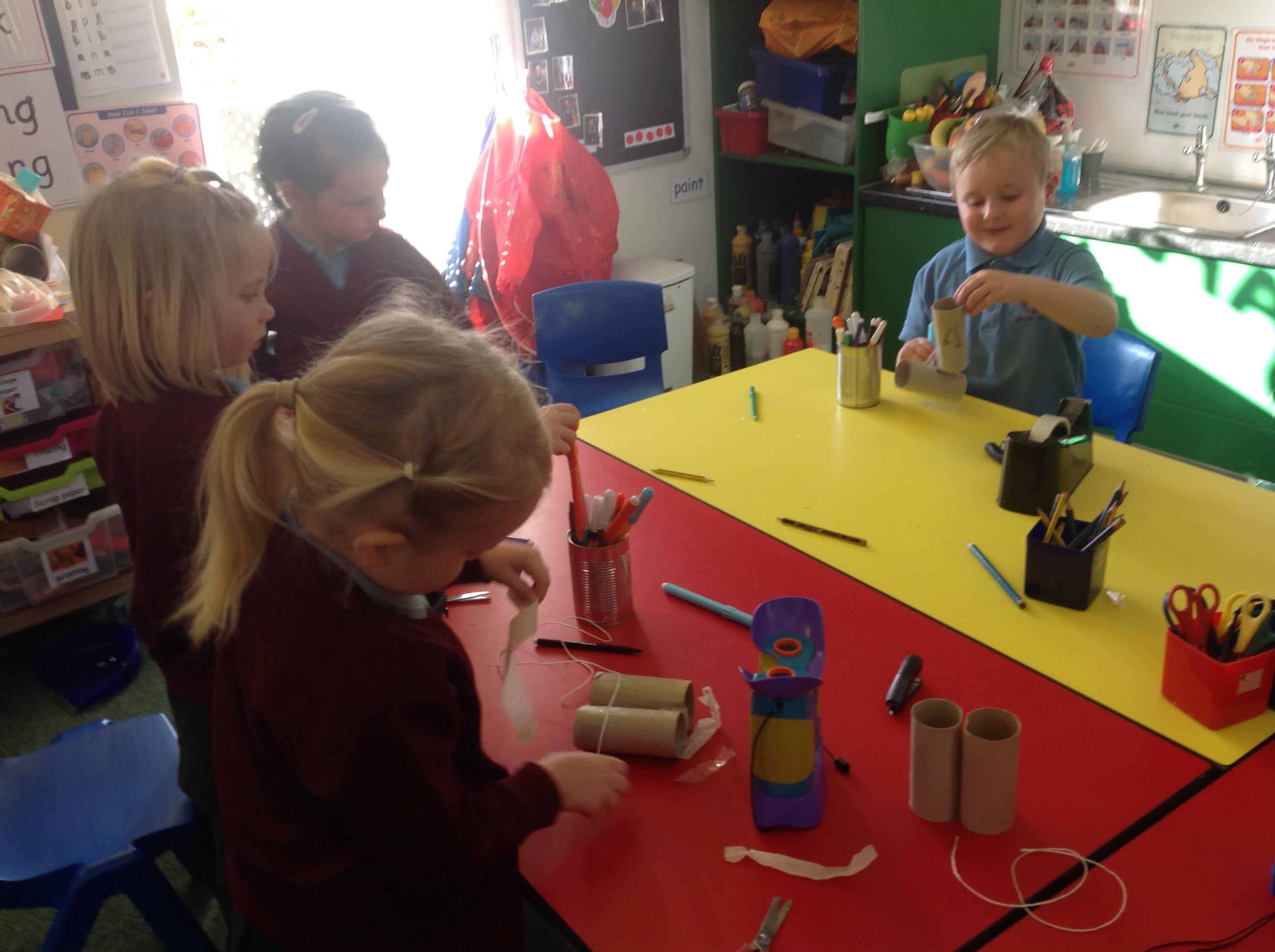 We all had a go at making binoculars on the day of the Great School Bird Watch and then we went out in groups to see what different birds we could see sitting in the school grounds. We saw crows, pigeons, black birds, wagtails and a robin, and various other birds flying overhead. We also saw a pair of crows sitting on their nest up high in a tree.
