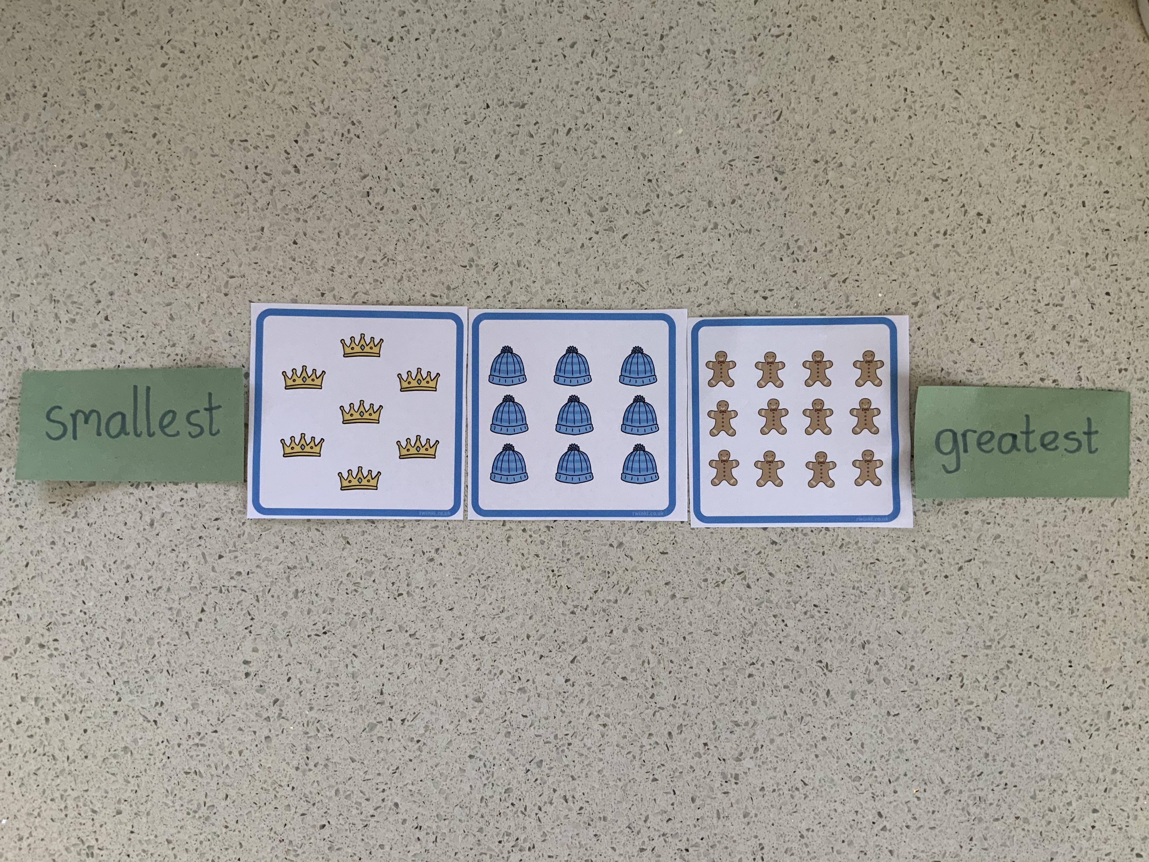 Yesterday we used the symbols < and > to help us compare two groups of objects. Today we are going to order and compare pictures and numbers using the language greatest and smallest. You will need to print off the labels below (or make your own if you prefer) and also the number/picture cards: