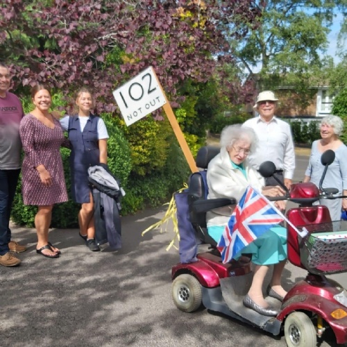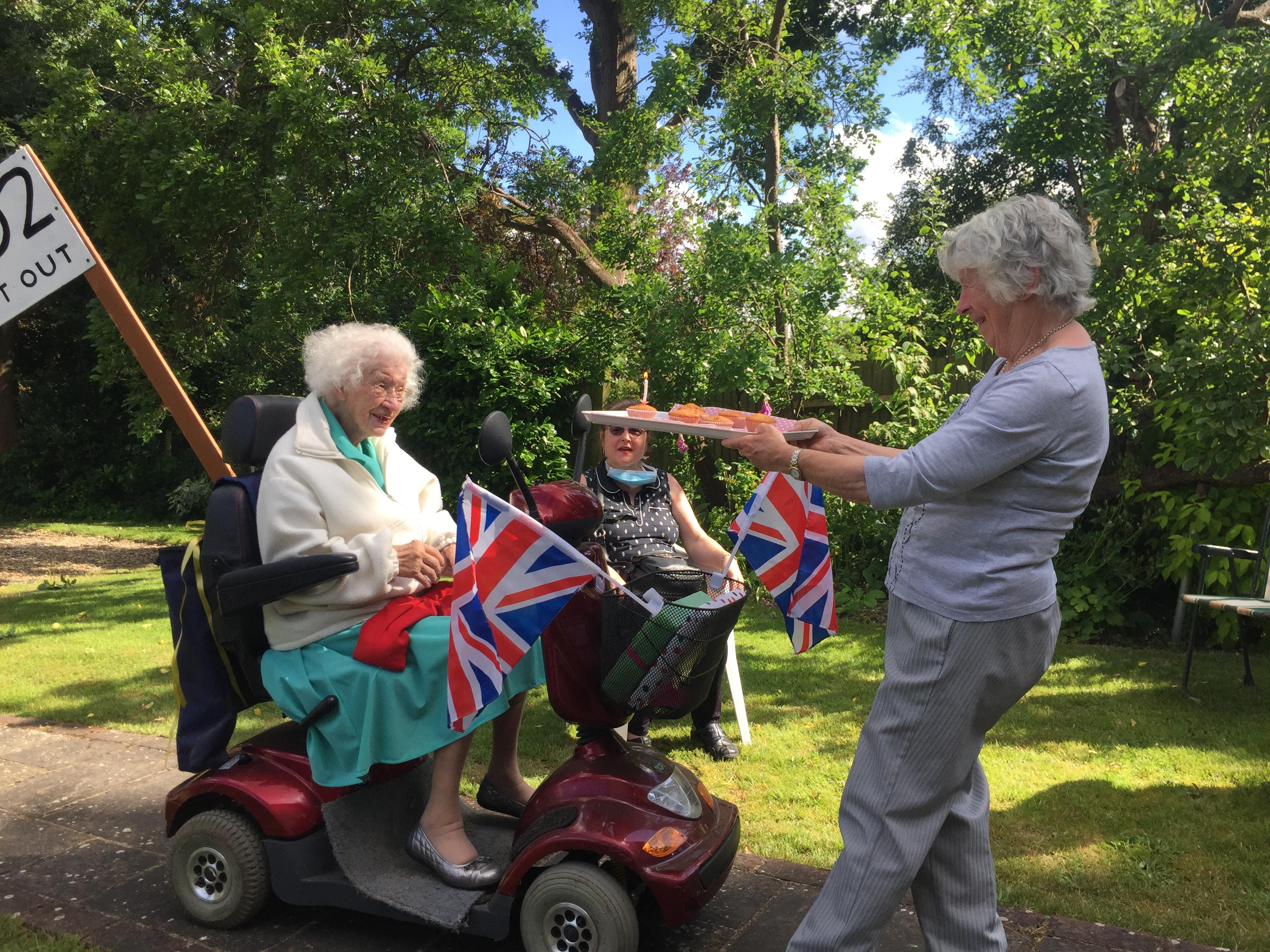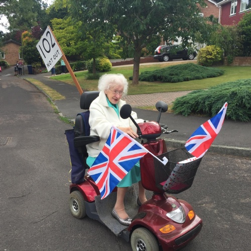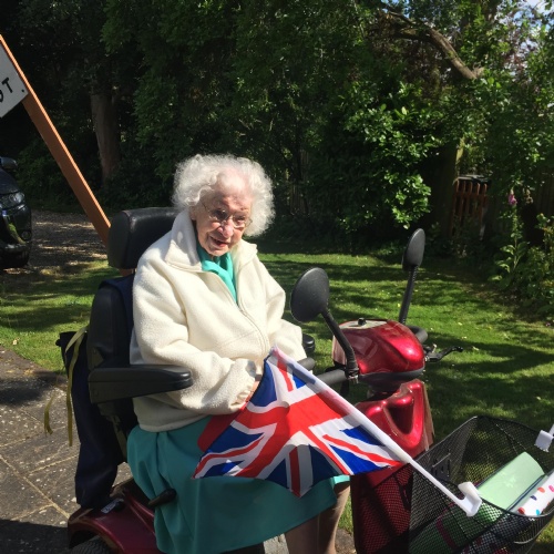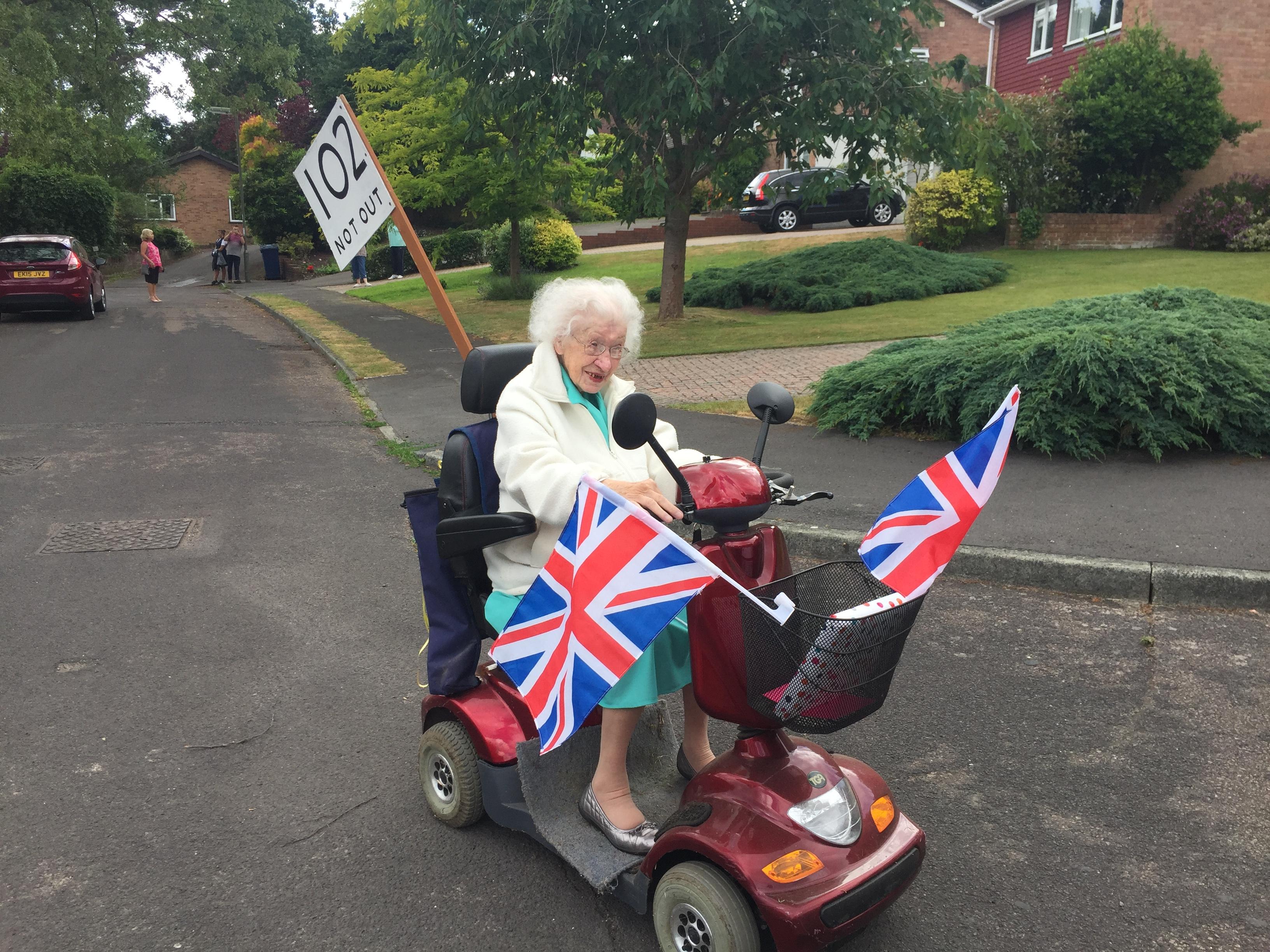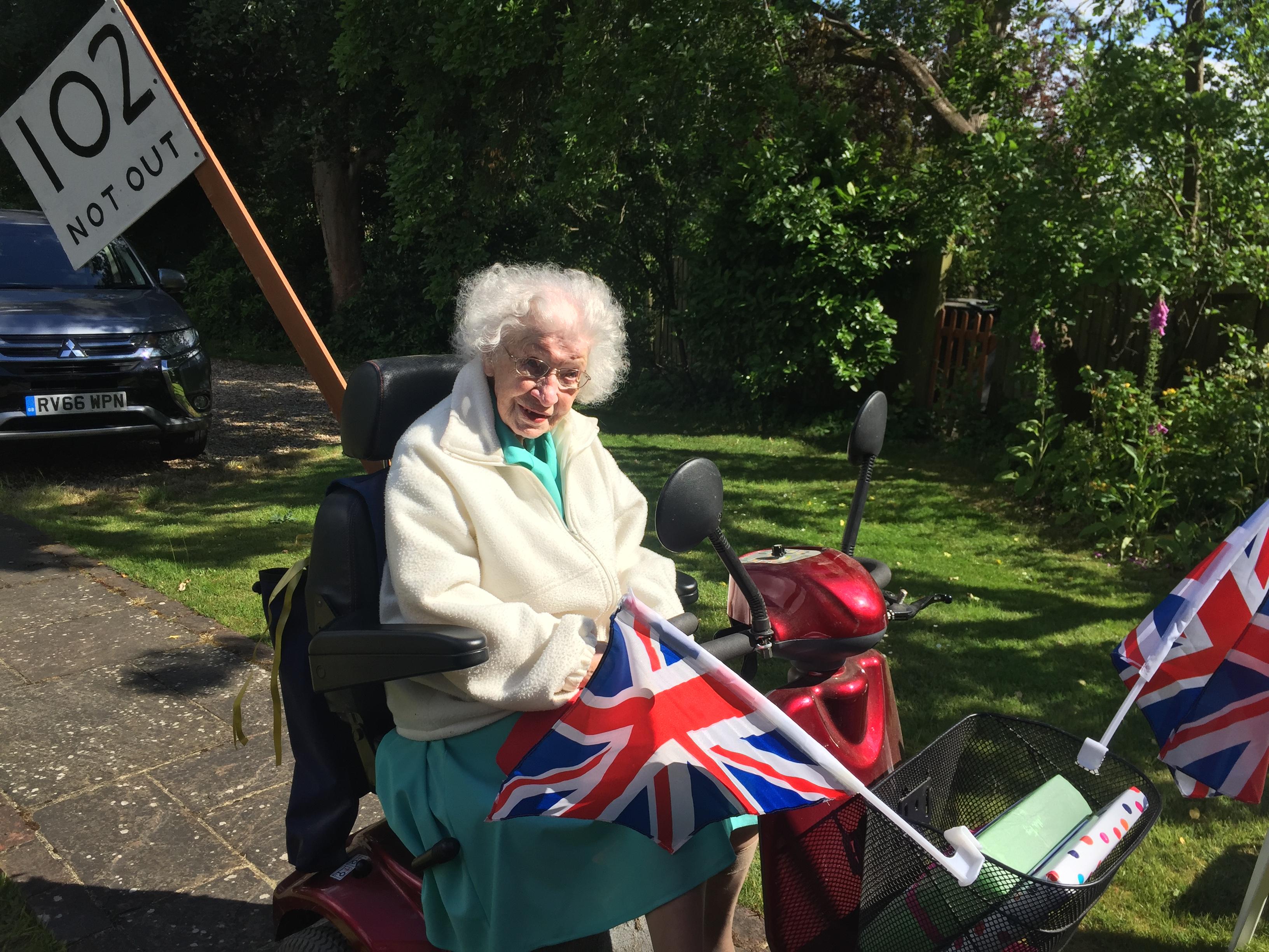 Yesterday was my grandma's 102nd birthday! She is an amazing lady. She still lives in her own home, which is in the bottom of and Mum and Dad's garden. She was a bit upset that she couldn't have a party this year, but we tried to make her feel special anyway. She went on her electric scooter for a lap of the roads near her house and loads of the neighbours came out to clap and wish her happy birthday. Some popped presents and cards in her basket and one house had made a big banner.