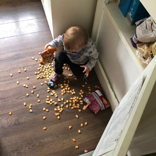 My other photo shows a certain cheeky little person who had helped himself to a packet of cheesy biscuits, which were in the cupboard at his house.  He had waited until his mummy had gone to wash her hands in the bathroom and then got to work.  I think, perhaps, mummy needs to either put those opened packets on a higher shelf or put them in a box.  You should know, he had already had his breakfast but the boy is an eating machine.  I suppose it will only get worse as he moves around more and burns up more energy.