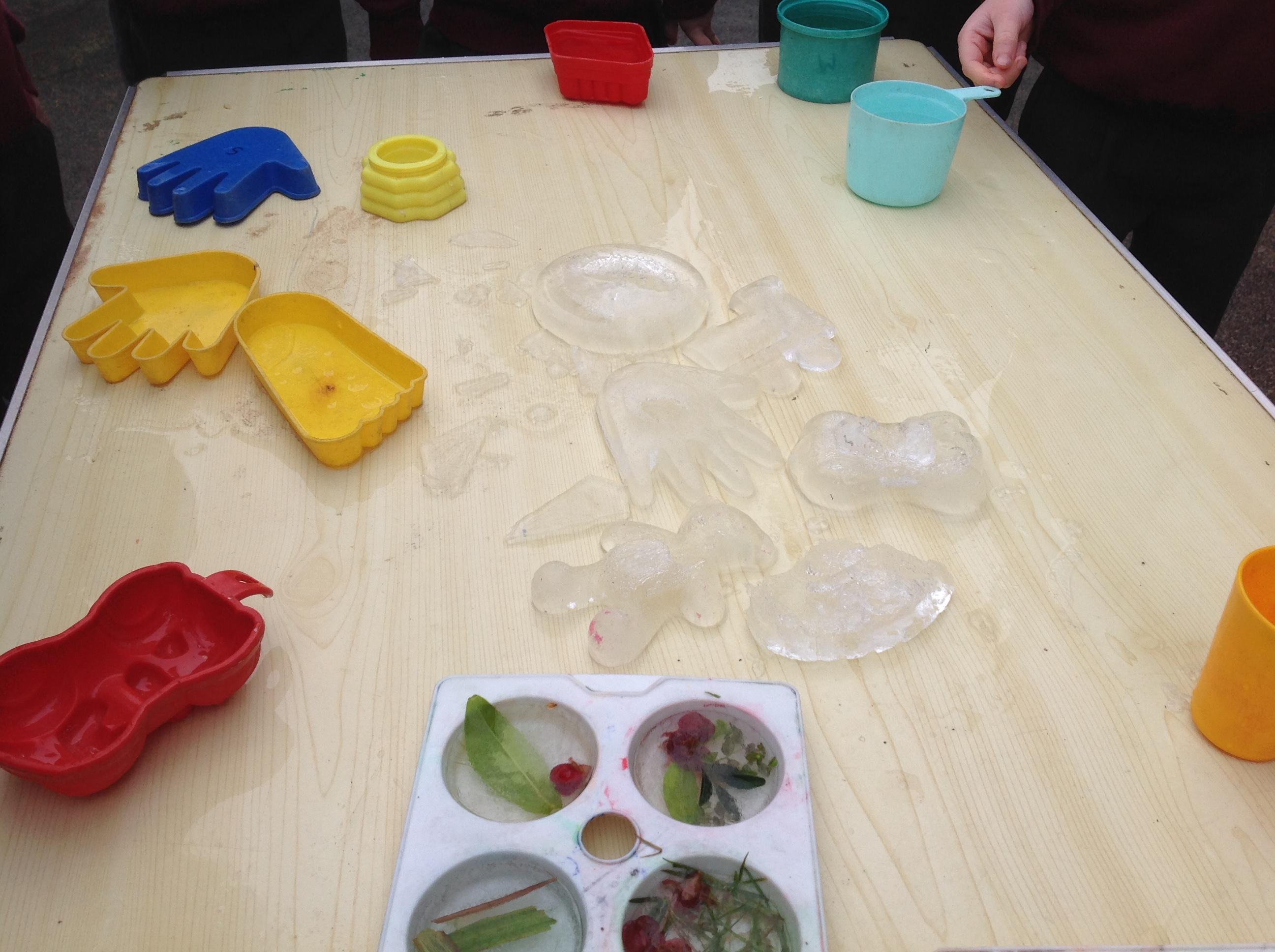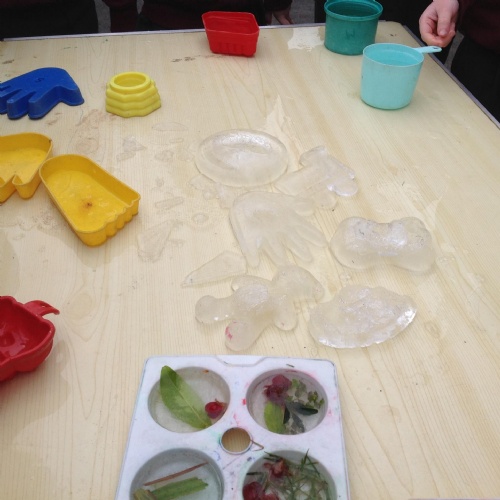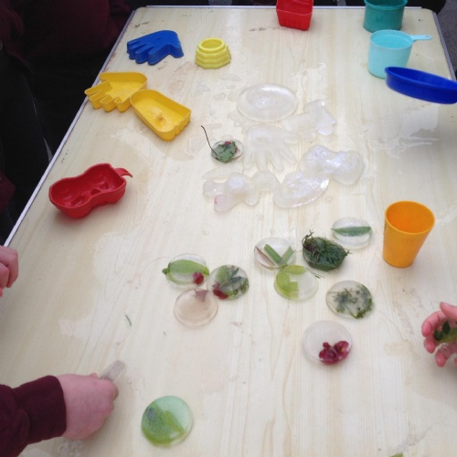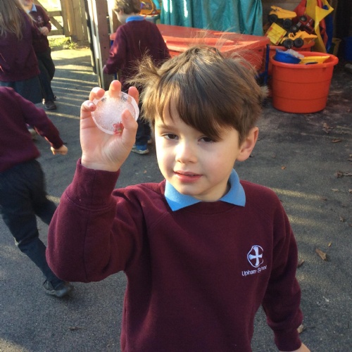 As it is meant to be another cold night again tonight, we could see if we could make some ice. Why not try leaving some water outside in a container overnight and see if it has frozen at all in the morning. You could even have a go at making some ice pictures or pendants using leaves or flowers in shallow trays/lids of water - see the explanation below and pictures from previous freezing adventures in Class 1.