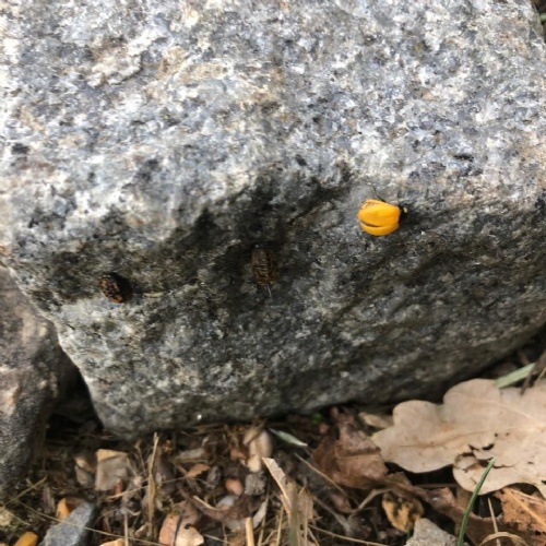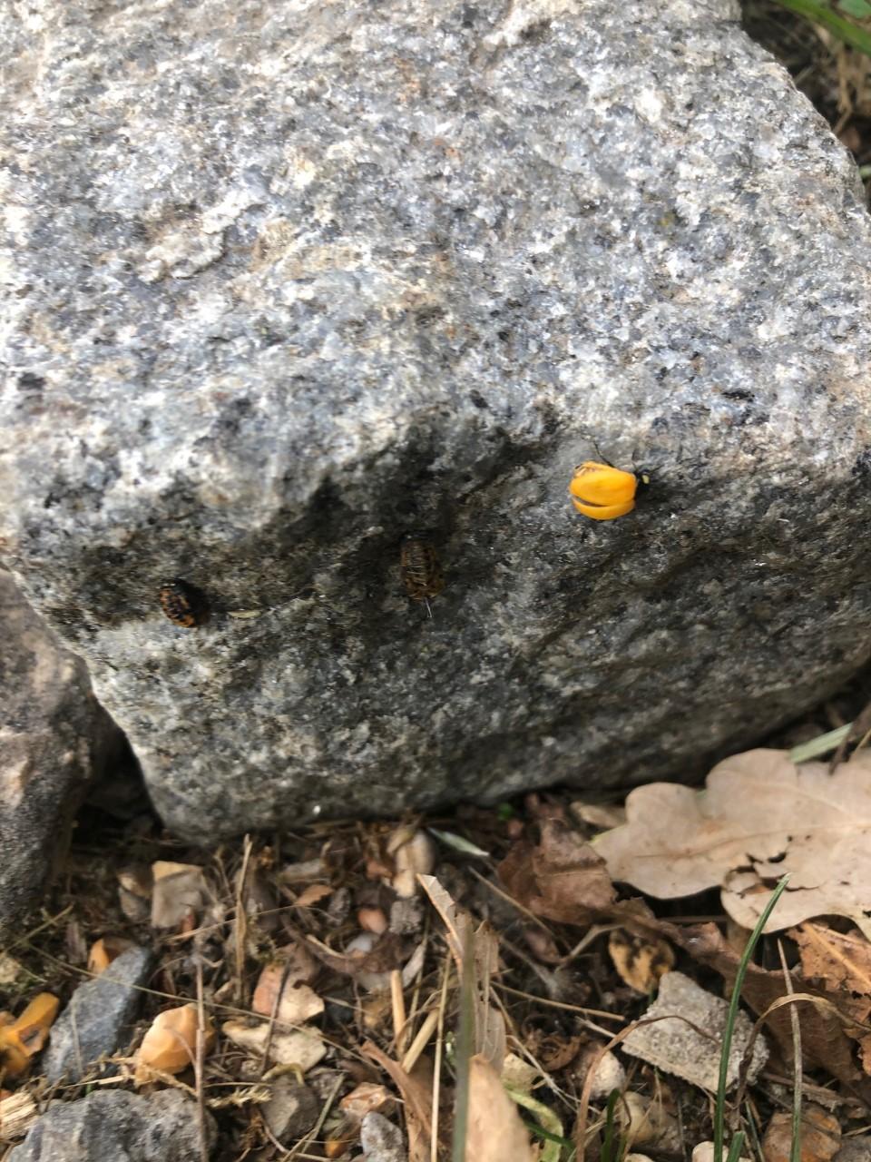 It's looking a little dreary outside with the forecast of rain sad.  We've been enjoying learning about minibeasts at school and it seems people have been learning about them at home in different ways too.  Jack went on a minibeast hunt early yesterday morning and found some ladybird cocoons hanging from a rock and was actually lucky enough to see a ladybird which had just emerged from one.  Not only did he see them, he took photos on his mum's camera and has sent them in for us all to share.  And look, the ladybird which has hatched is yellow with no spots - I've tried to find out if ladybirds don't have spots when they hatch and then develop them a little later - I couldn't find the answer.  Does anyone know?  All that I kept getting referred to was the 22 spotted ladybird.   Thanks for sharing Jack.