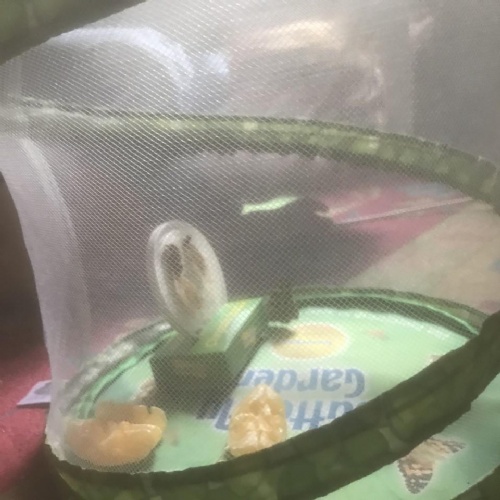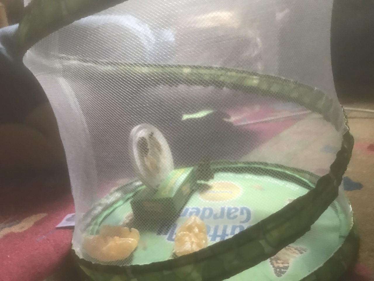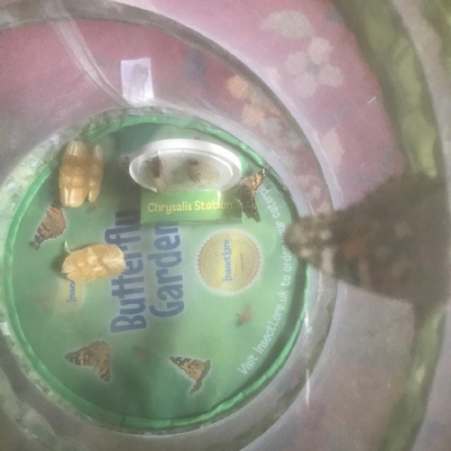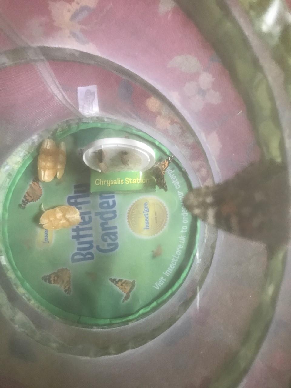 Also, Theo has been keeping caterpillars at home which had changed into chrysilises and yesterday morning butterflies began to emerge.  Theo's butterfly , Baby Eden, had emerged, Eliza's butterfly, Rosie, had emerged, but they are still waiting for Ozzie's butterfly, Batman, to emerge!  Theo says that Baby Eden is the one at the top.  Thanks for sharing Theo.